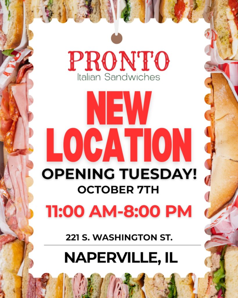 Pronto Sandwiches is thrilled to announce the opening of our newest location at 221 S. Washington St. in Naperville! WWherever you are in Chicago’s Western Suburbs, you’re only minutes away, you’re right around the corner from an authentic taste of Italy.